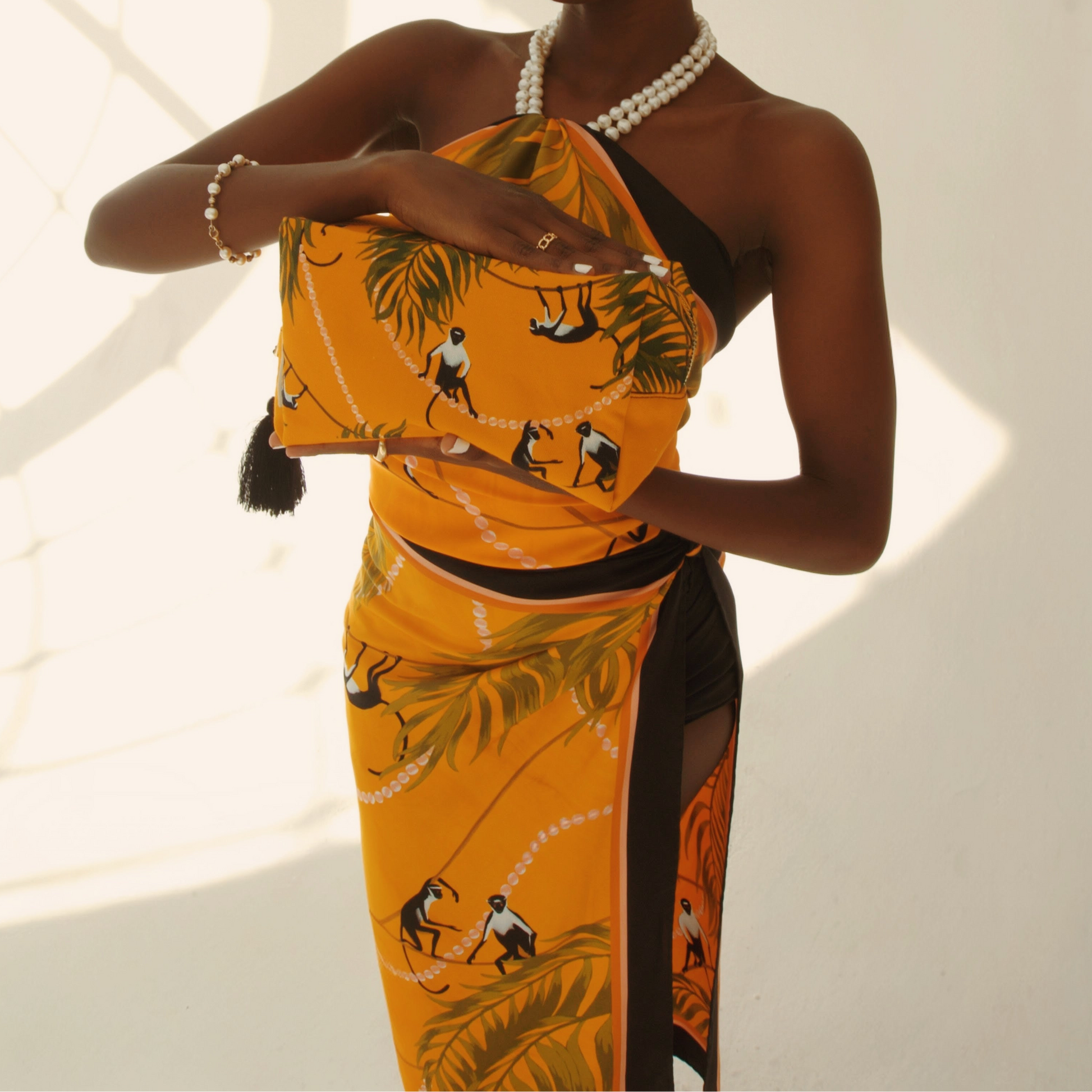 In our Primates in Pearls collection, playful Roloway monkeys swing from ropes and pearls in a lush gold jungle. Adorned in pearls frolicking in a rich jungle of gold tones, these primates take “monkeying around” to a whole new level. The iconic black triangular coloring on their face paired with their beautifully sleek silhouette makes them a beautifully unique species and a great inspiration for our collection!