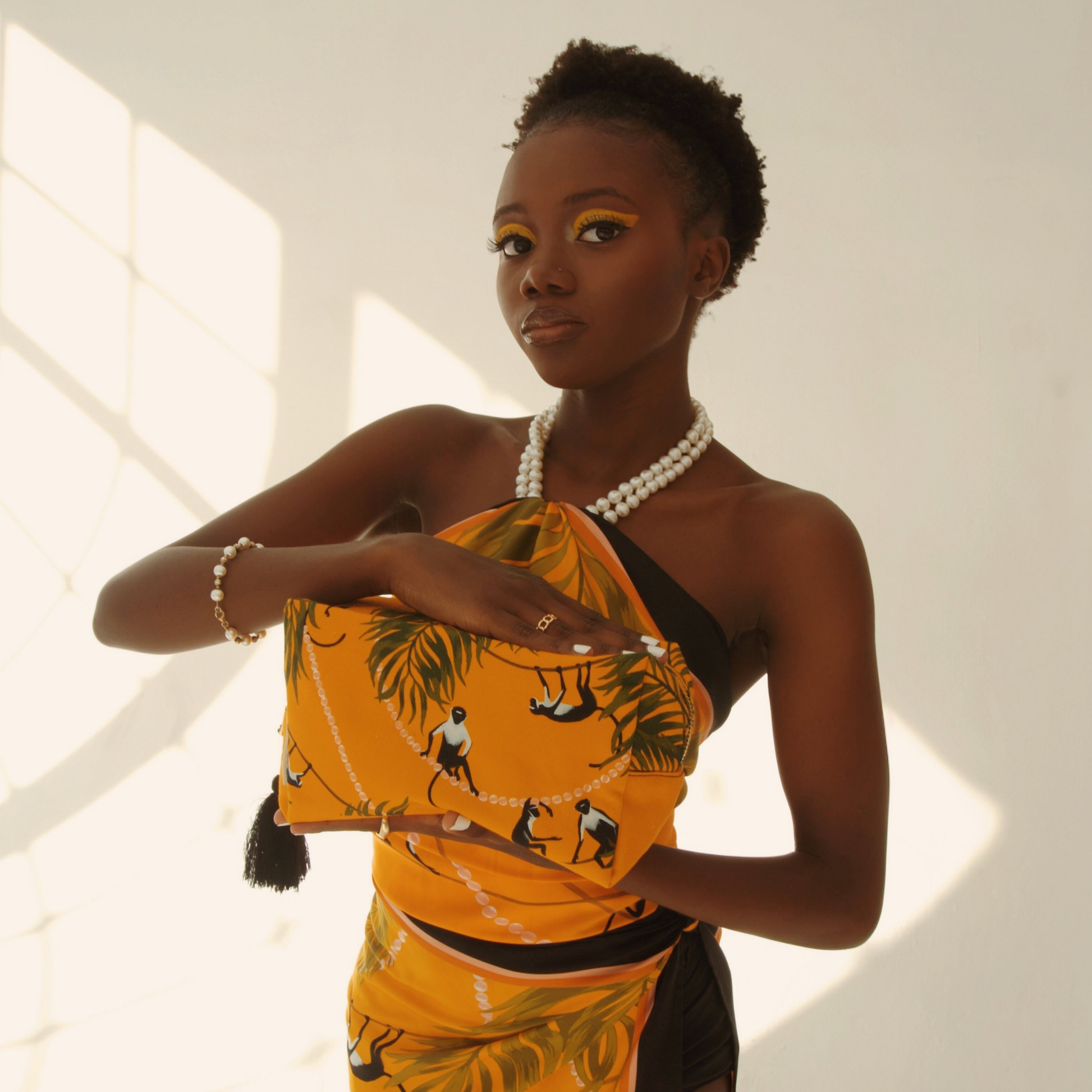 In our Primates in Pearls collection, playful Roloway monkeys swing from ropes and pearls in a lush gold jungle.